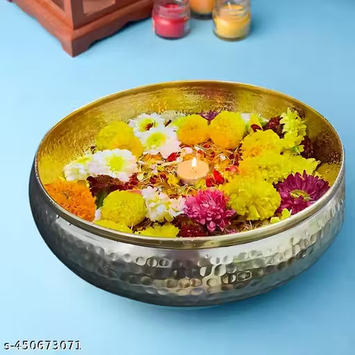 During festivals like Diwali, Ganesh Chaturthi, and Varalakshmi Pooja, <warning name='Holme's'>homes</warning> are adorned with a variety of decorative items that enhance the festive atmosphere. Pooja decoration items for home, such as brass urli bowls, diya stands, and flower bowls, are essential in creating a sacred and elegant ambiance. Brass pooja items like urli bowls for home decor and floating flowers for water bowls add a traditional touch. For Ganesh festival decorations, people often use background decoration stands, door decoration items, and decorative items for the pooja room. The pooja room is typically enhanced with metal diyas, copper bowls for flower decoration, and diya oil for pooja. Diwali decor items, including decorative diyas, copper urli bowls, and floating candles, are popular choices for both indoor and outdoor spaces. The return gifts for housewarming ceremonies and decorative bowls for home decor make thoughtful additions to any celebration. Whether you're looking for mandir decorations or diwali decoration items for home decor, there is an endless array of options like flower-shaped diyas, hanging urlis, and table decor items to choose from. These traditional home decor items are often crafted from brass, copper, and silver to evoke the charm of festive India.